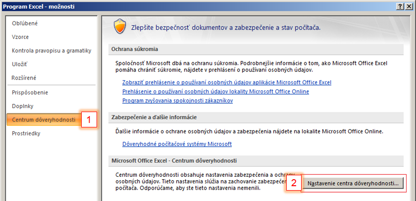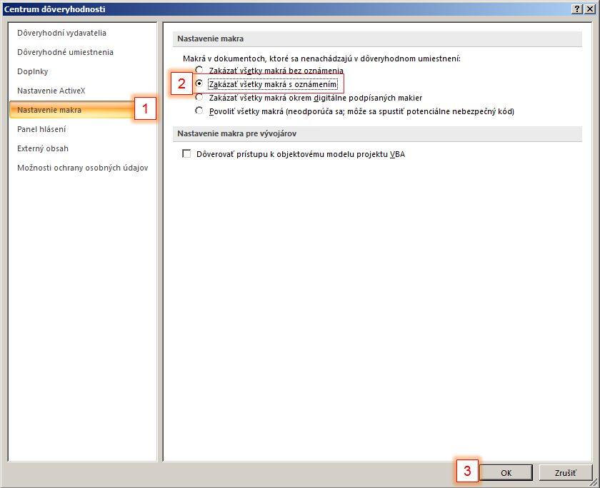 - Prejdite na záložku Nastavenie makra, z ponuky vyberte možnosť Zakázať všetky makrá s oznámením a potvrdte tlačidlom OK.