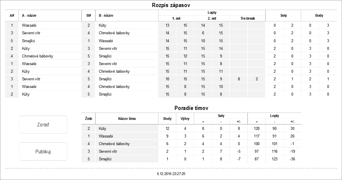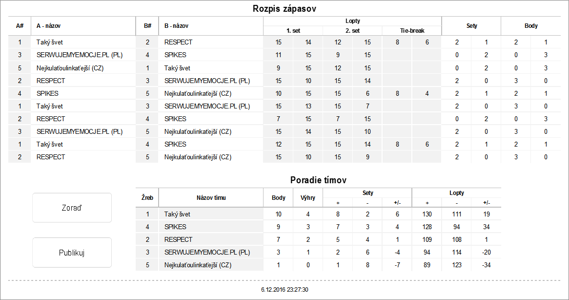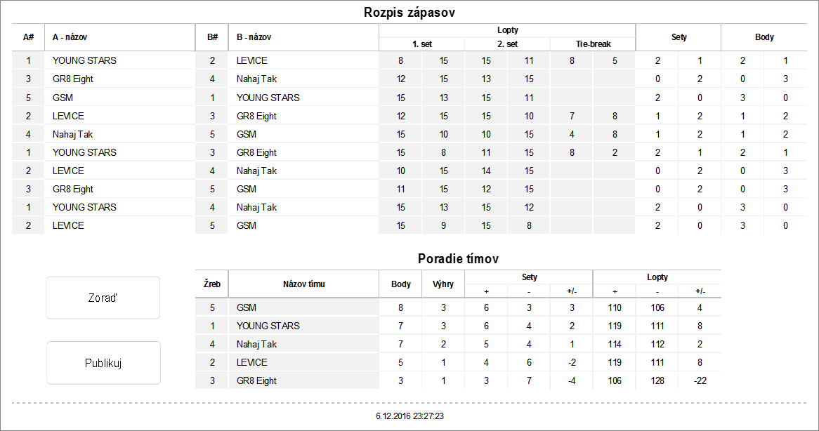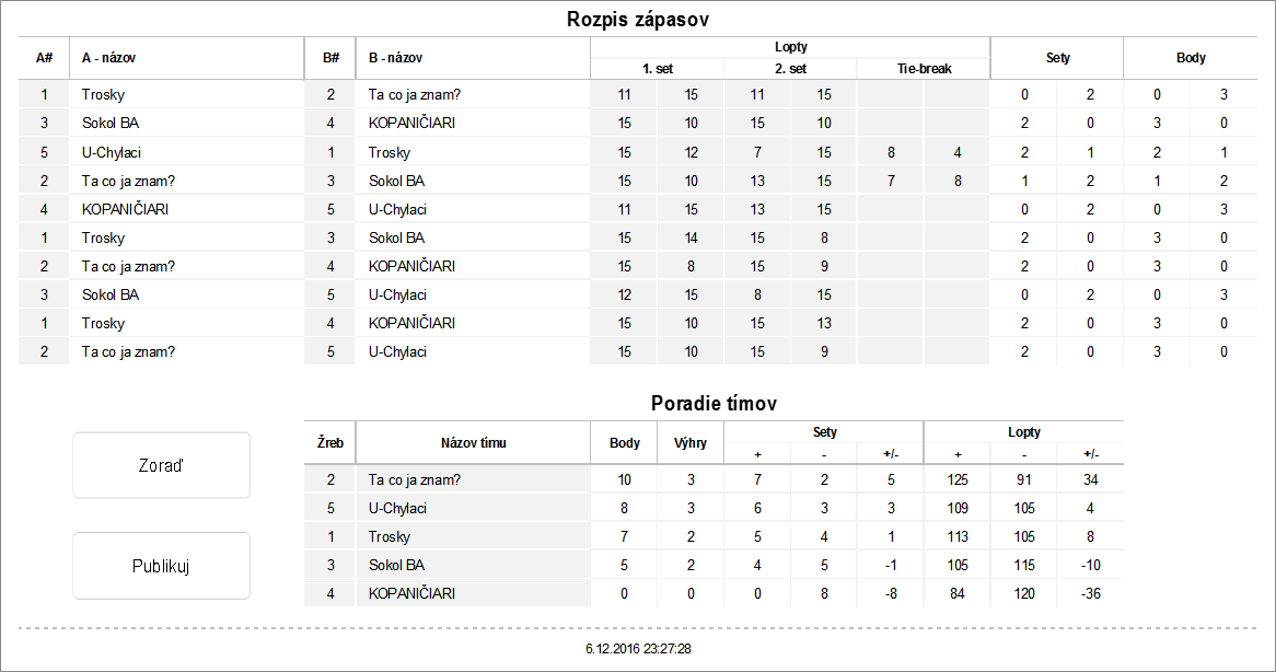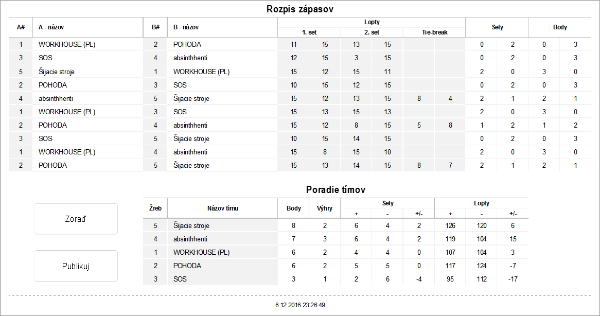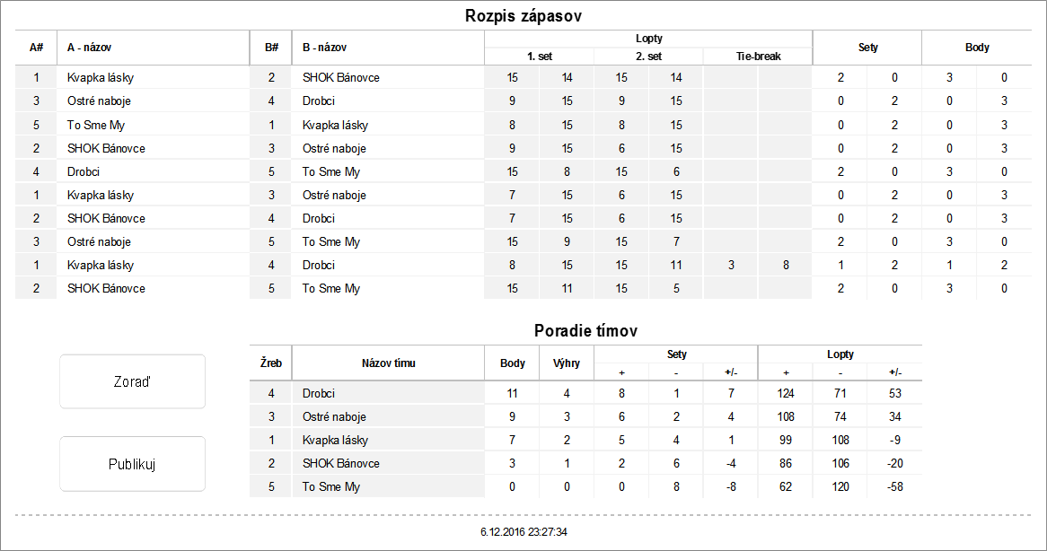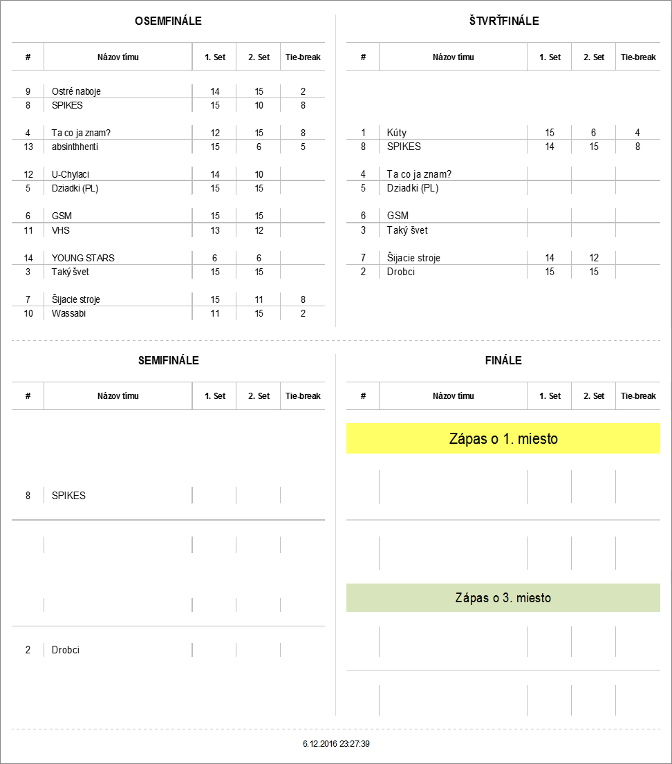 Zápas základná časť - dva víťazné sety do 15 (bez rozdielu 2 bodov), tie-break do 8 (bez rozdielu 2 bodov)