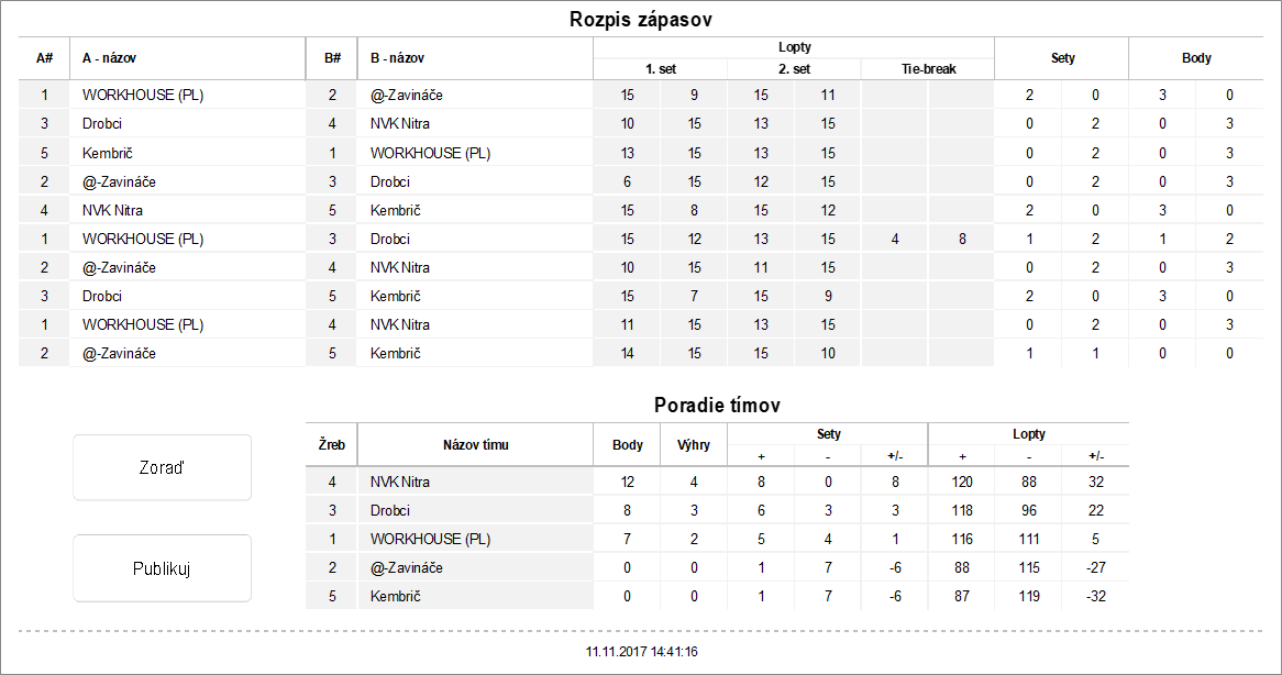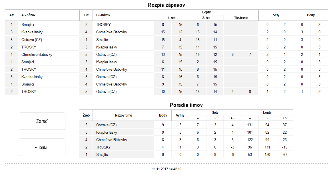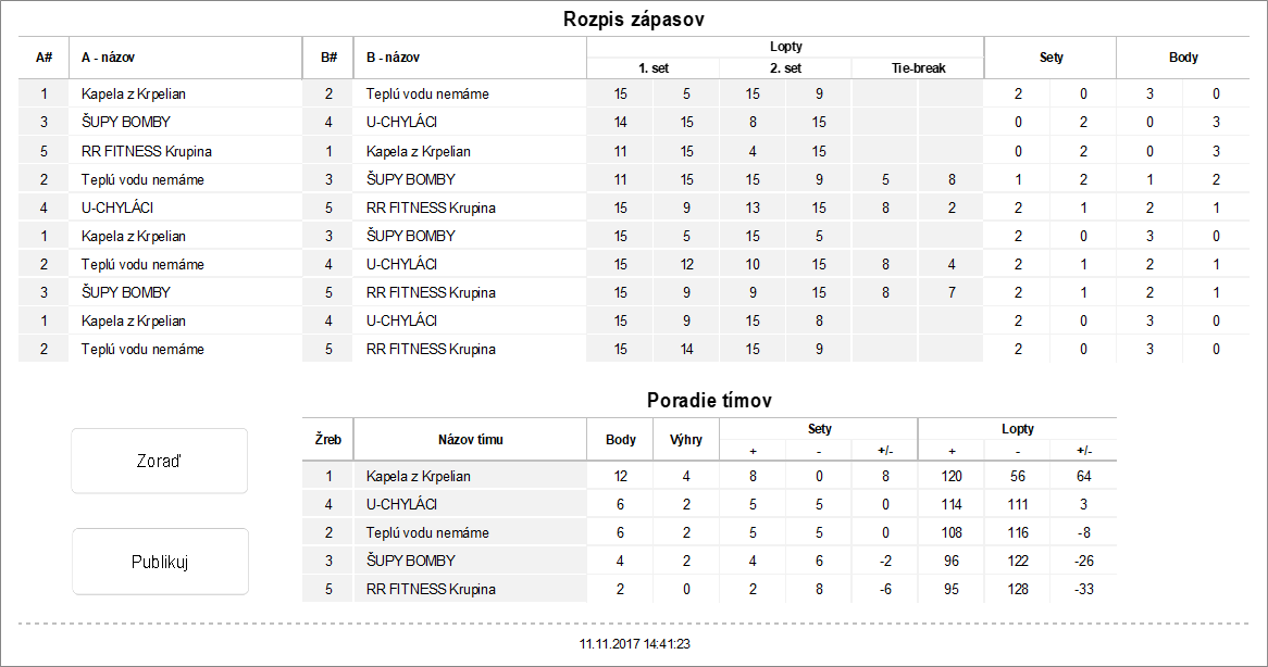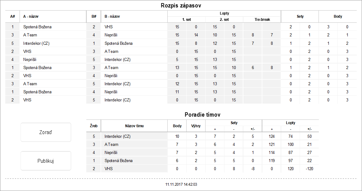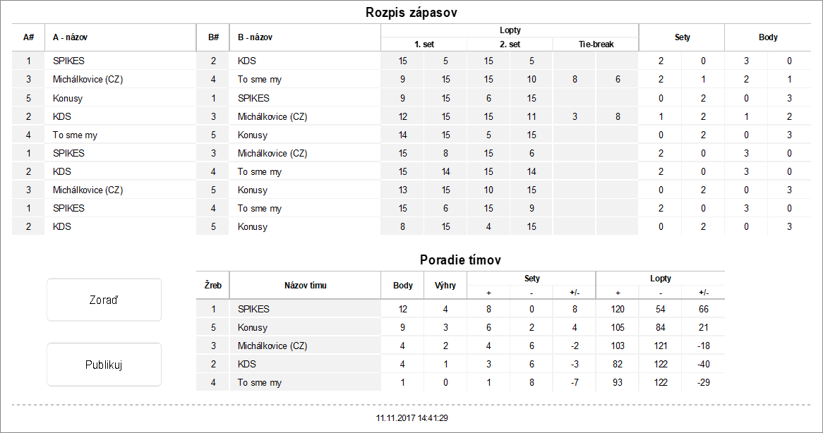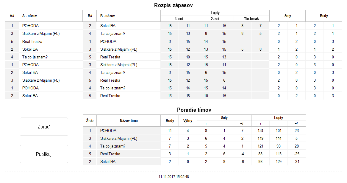 Zápas základná časť - dva víťazné sety do 15 (bez rozdielu 2 bodov), tie-break do 8 (bez rozdielu 2 bodov)