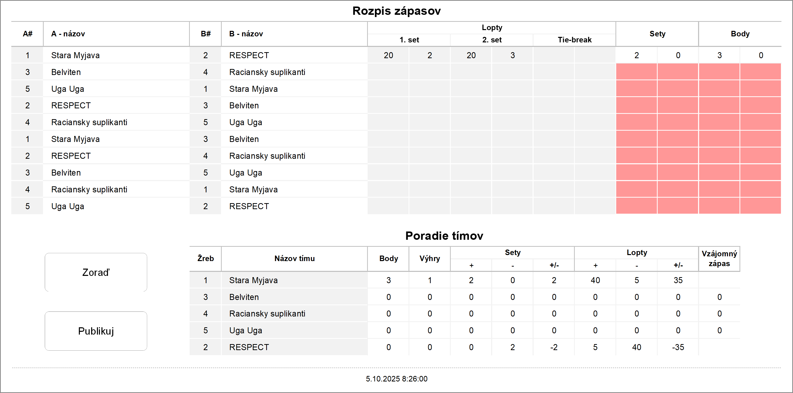 Zápas základná časť - dva víťazné sety do 15 (bez rozdielu 2 bodov), tie-break do 8 (bez rozdielu 2 bodov)